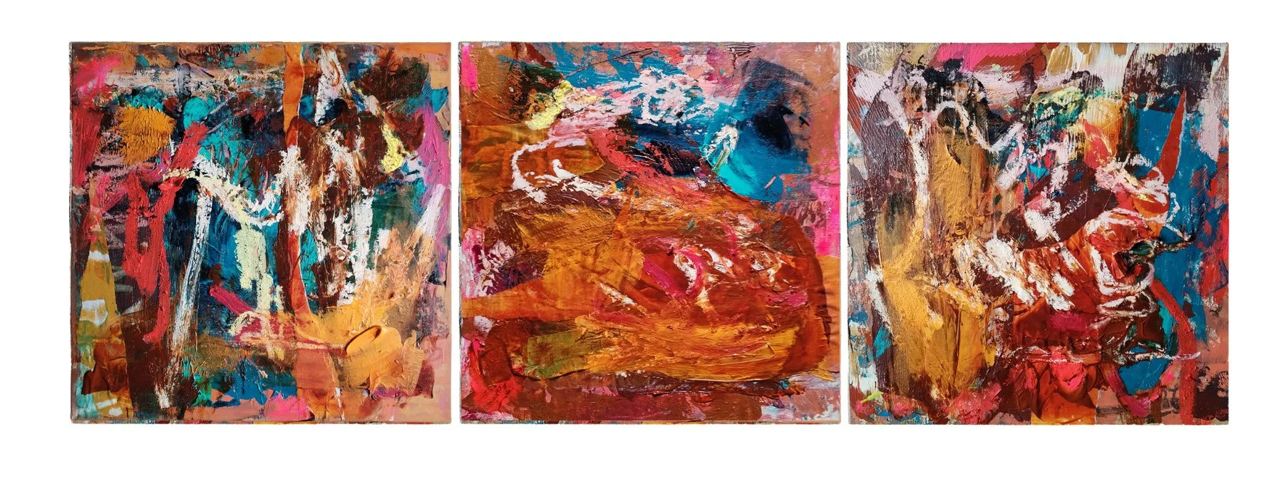 Acrylic, mixed media and collage on 3 wood panels, each 30 × 30 cm